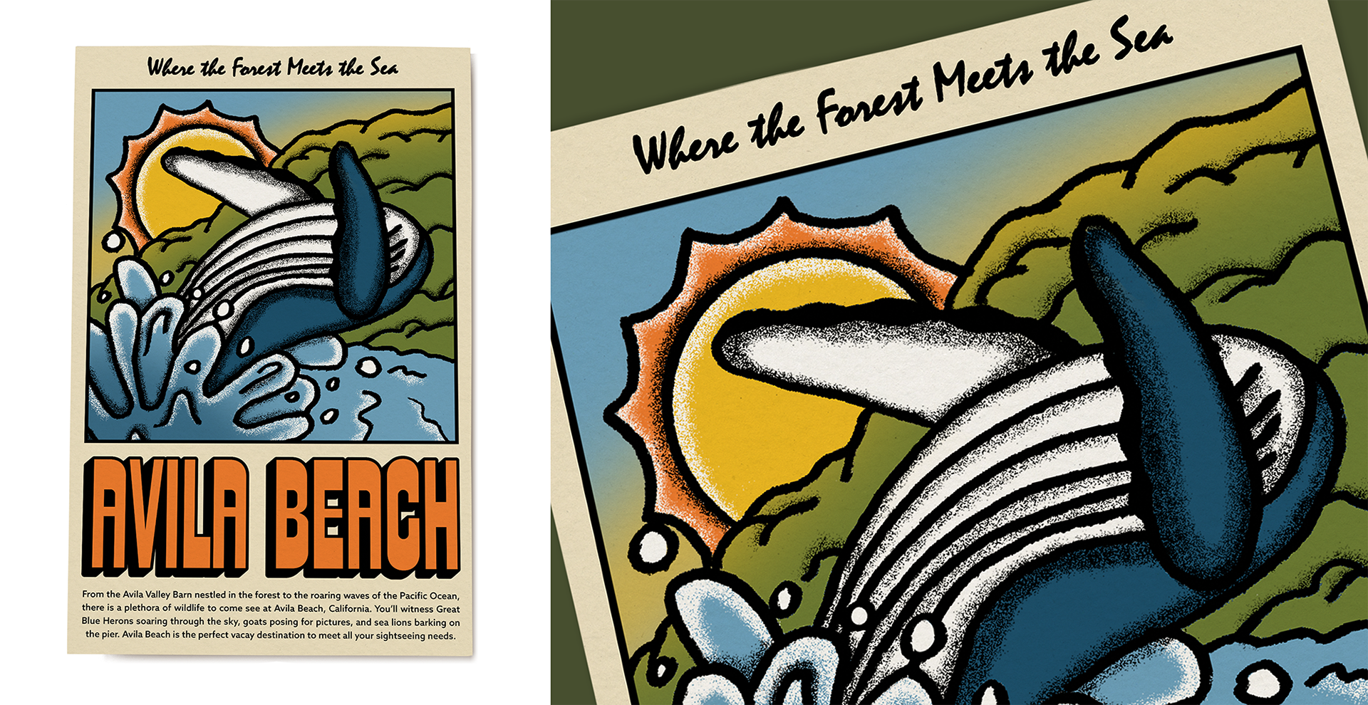 I was inspired by vintage illustrative beach posters because of their bold, colorful, and somewhat abstract eye-catching elements. For the typography, I used drop caps for large headers because they are reminiscent of retro type designs which contribute to the overall vintage theme of the campaign. I made sure to use a range of different textures and lighting techniques as they greatly affected how engaged a potential tourist would be in reading more about Avila Beach.